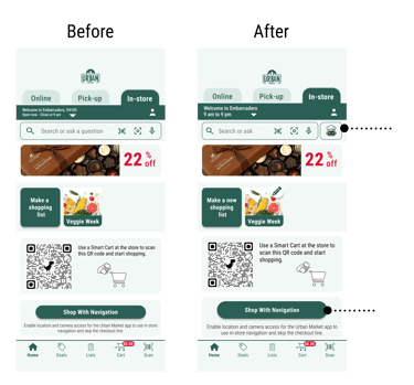 Enabled quick item scanning, cart additions, and guided navigation with AR triangles.