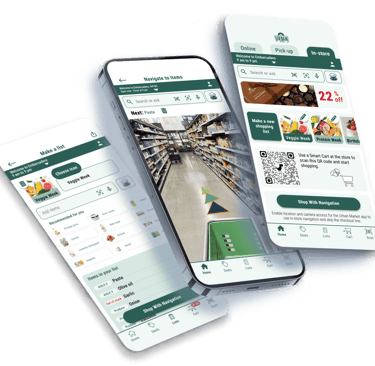 Visualized core user flows, including shopping list creation, in-store navigation, and checkout.