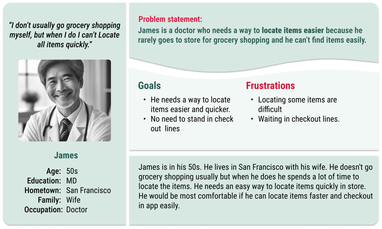 After conducting user research, I realized that in-store grocery shoppers struggle to find and locate items efficiently and often experience frustration due to long checkout lines. Also, I realized some people don't know what to buy from the grocery store to make a healthy meal at home. These challenges make the overall grocery shopping experience time-consuming and unenjoyable, leading to reduced operational efficiency and lower customer satisfaction. Therefore, this project aims to address the following key challenges: