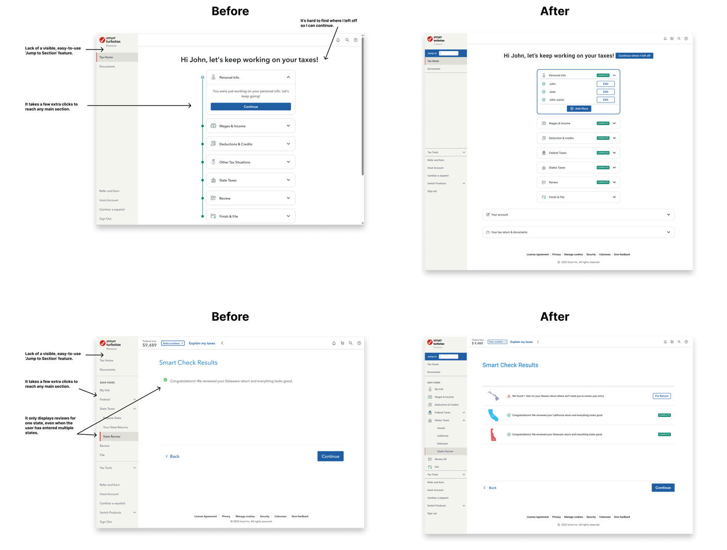 Ever left TurboTax mid-way and returned unsure where you left off; forced to backtrack through several pages or click around in confusion to find a section? This case study tackles those pain points to create a smoother, more intuitive experience.